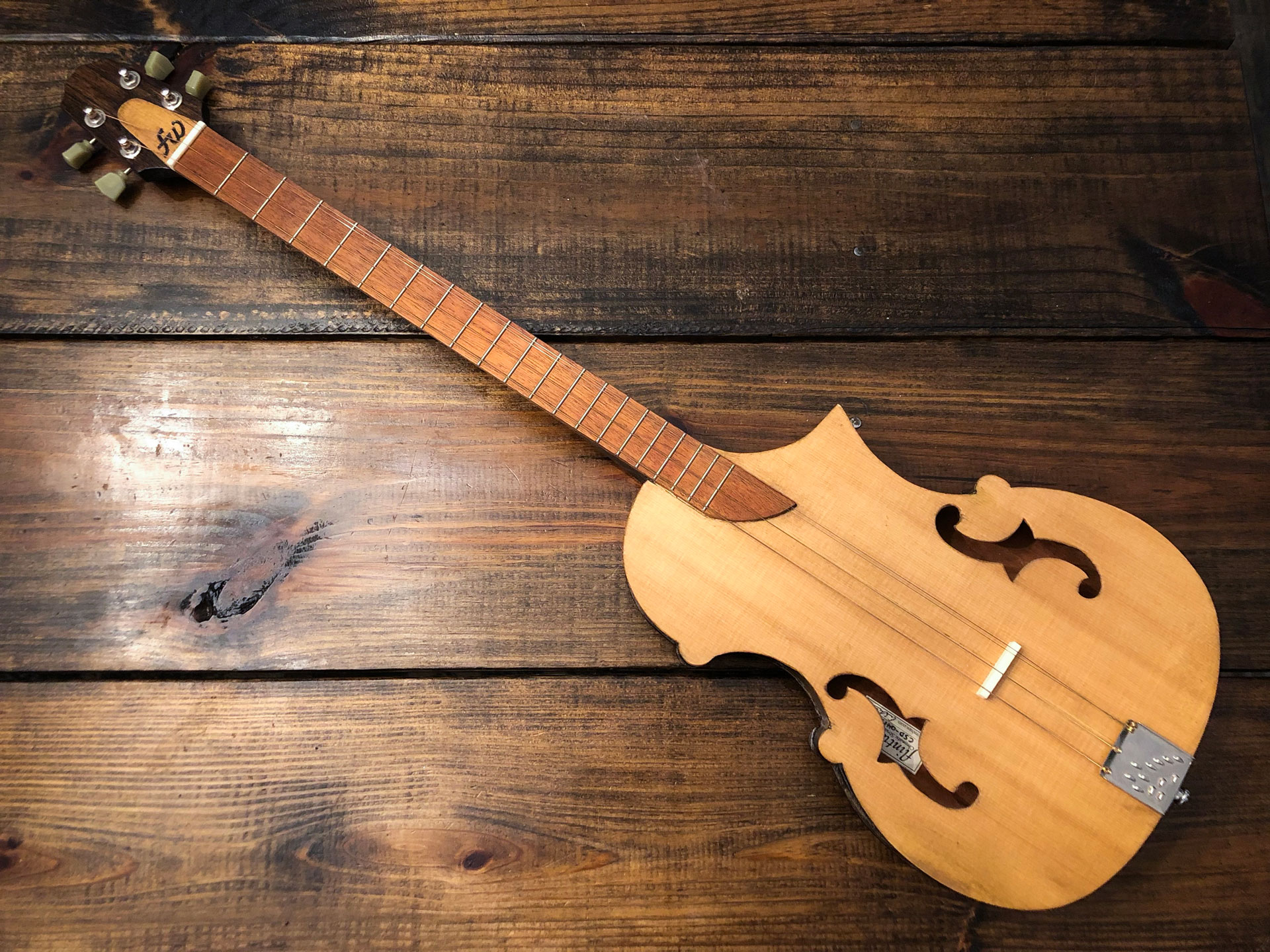 The Flintwood C.S.D. (Chromatic Strum Dulcimer) has a complete chromatic fret layout which allows the instrument to stay in a form of standard tuning. It feels a little like playing the bass guitar but has a sound that is much like a mandolin.